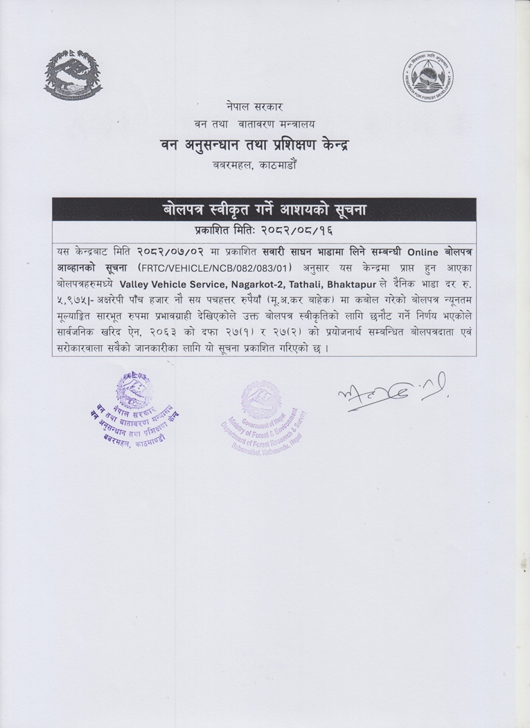 Forest Research and Training Centre is a Government body under the Ministry of Forests and Environment, responsible for forestry research and survey activities at the national level. It also offers forestry training and extension services. With an objective of conducting forest resources survey, Forest Resources Survey Project (FRSP) was set up under the Department of Forests in 1963. It was later upgraded as the Forest Survey and Research Office (FSRO) in 1976. The office was reformed to a Forest Research and Survey Centre (FORESC), a semi-autonomous body in 1993. It was emerged as a separate Department of Forest Research and Survey in 1999. In 2018, the Department and the Central Forestry Training and Extension Centre were merged and established as the Forest Research and Training Centre (FRTC).